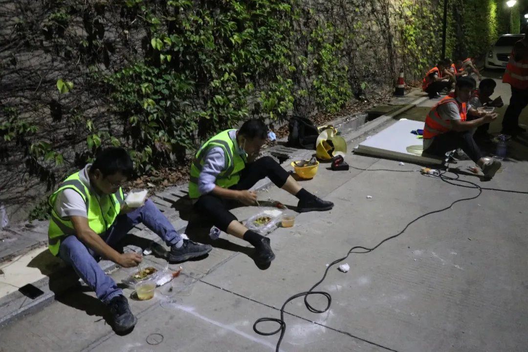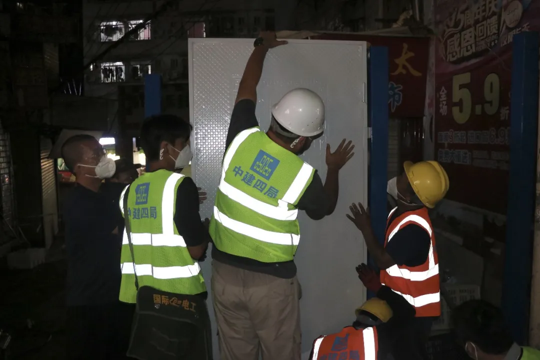 原计划安装围挡30米,晚上临时增加到200余米,剩余材料不足。正值中秋假期,多数工厂未开工,项目团队多方协调,紧急联系材料厂,黄维权拨打了几十通电话后,终于在晚上9点联系到供应商。但因工厂没有工人,应急队党员先锋陈建挺带着6位项目管理人员赶到工厂搬运立柱,将材料运送到施工现场。 在中秋团圆之夜,12名四局建设者舍小家,为大家,依旧坚守在战“疫”一线。连夜施工至凌晨三点半,200余米围挡安装完毕。