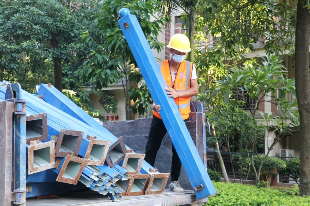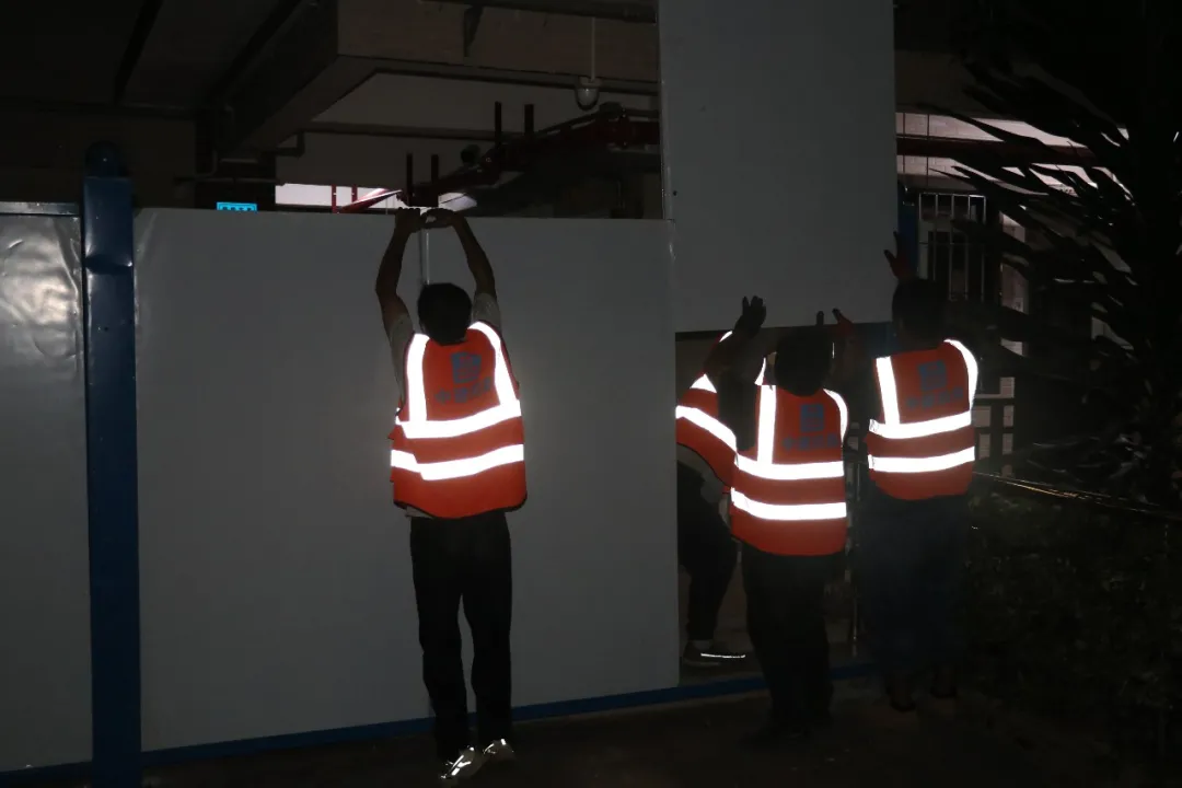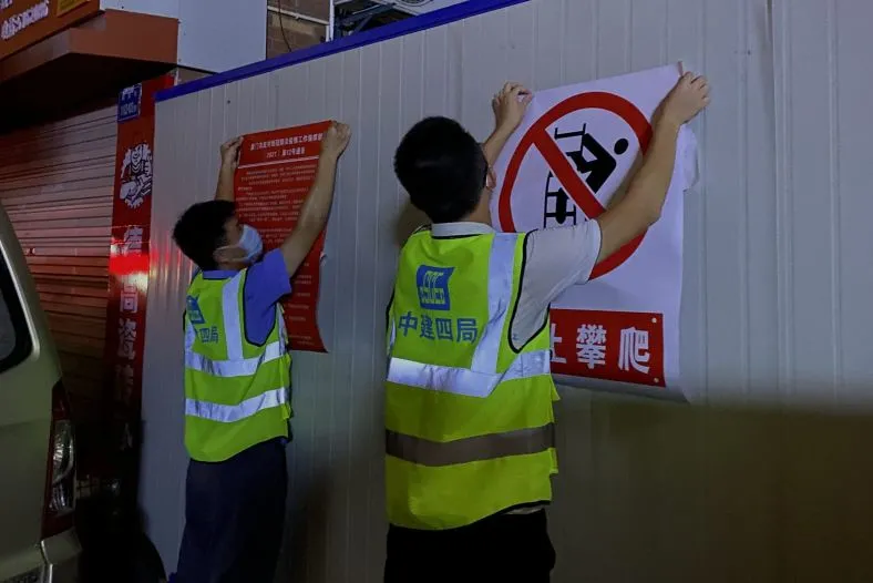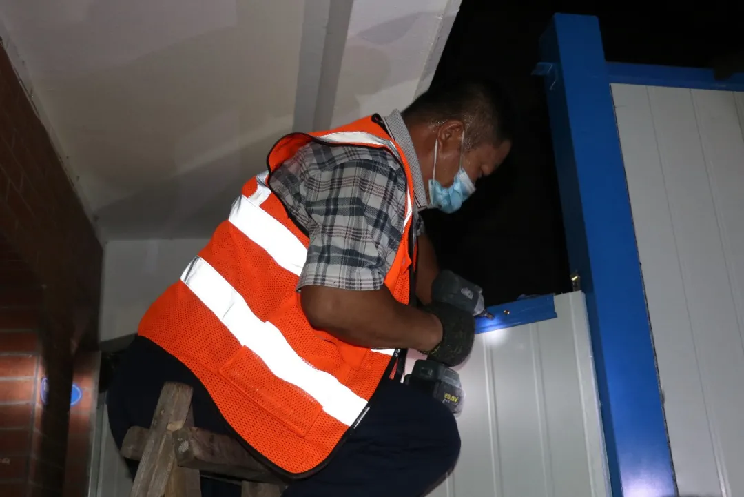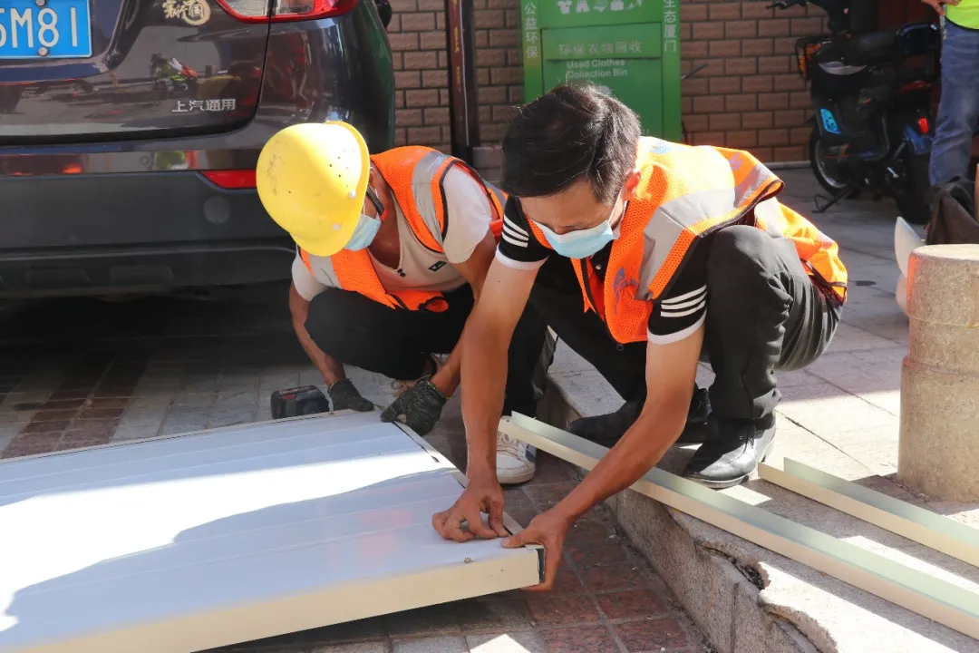 此外,社区道路狭窄、错终复杂,部分货车无法进入,需要人工转运,管理人员和工人在36度的高温下共同将材料搬运至各施工点。 烈日当空,我在岗,月亮走了,我不走。为尽快完成紧急任务,项目团队实行“24小时两班倒”工作制,分工作战,各工序环环相扣,历经48个小时的奋斗,208名一线建设者完成该社区近400个出入口近1300米围挡安装,并将600余张防疫宣传海报张贴在社区各出入口。