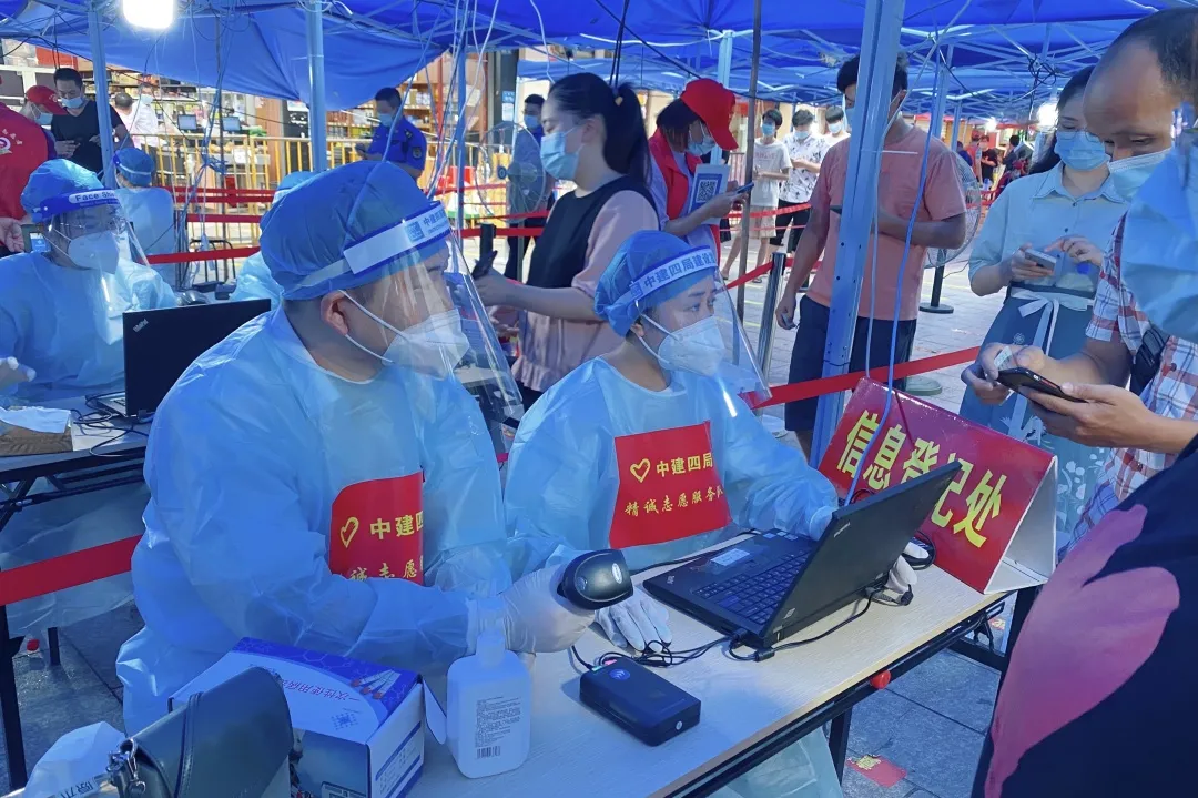 9月23日下午,援建应急队又赶赴禾山街道某社区参与封控管控施工。建设现场,人流量大,不时有居民驻留围观,管理人员一边协助社区疏散人员,一边辅助工人施工,在社区4处出入口安装30余米围挡及3扇门。凌晨12点,应急队接到增设一道门的应急任务,“疫情就是命令”,应急队火速组织人员赶往现场施工,凌晨3点半完成所有建设任务。 总承包公司发扬攻坚克难、连续作战精神,穿梭于各个援建现场,争分夺秒跑出四局速度。9月14日至9月23日,累计参与6个小区的应急隔离围挡建设,投入建设者380人次,安装围挡2000余米,搭建水马围挡1000余个,全力构建湖里区居民安全屏障,为阻断疫情传播风险作出重要贡献。 服务“疫”线,共克时艰 面对厦门市复杂严峻的疫情防控形势,厦门市政府启动全市全员核酸检测。“我报名、我参加”,总承包公司党员、精诚志愿者积极响应号召,加入防疫志愿服务队伍。