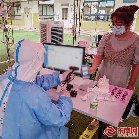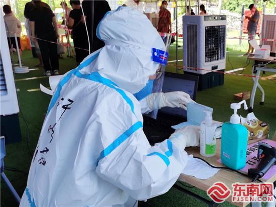 许明茹在战疫一线(厦门集美法院供图) “我妈妈是志愿者,我一个人来” “小朋友,你还没登记哦!”一天上午,集美法院立案庭副庭长许明茹所在的通道里,一名大约7岁的小朋友随着待检队伍往前移动着,每次前进,他都蹦蹦跳跳地落在一米线上,像是在玩跳格子游戏。到了许明茹面前,本该进行信息登记的他,却径直走过了信息登记台。此时,许明茹温柔地叫住了他。 “妈妈叫我带这个本子过来做检测!她在前面入口做志愿者,很忙,我就一个人来了。”小男孩的手紧紧攥着翻得有些发皱的户口本。 看着眼前的孩子,许明茹想起了家里的女儿。此次星夜支援同安,许明茹出发时,女儿还睡得香甜,她没有好好告别,就奔赴抗疫一线。想到这里,许明茹不禁有些动容。 “嗯!小朋友真棒,你妈妈肯定会为你骄傲!”许明茹对小朋友竖起了大拇指。“把本子给阿姨帮你录入信息好吗?”接过户口本,许明茹仔细核对一行行信息并录入系统中,微笑着目送他淘气可爱的身影走向负责采样的医护人员。