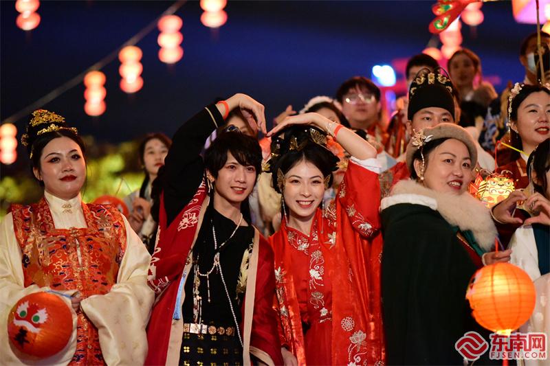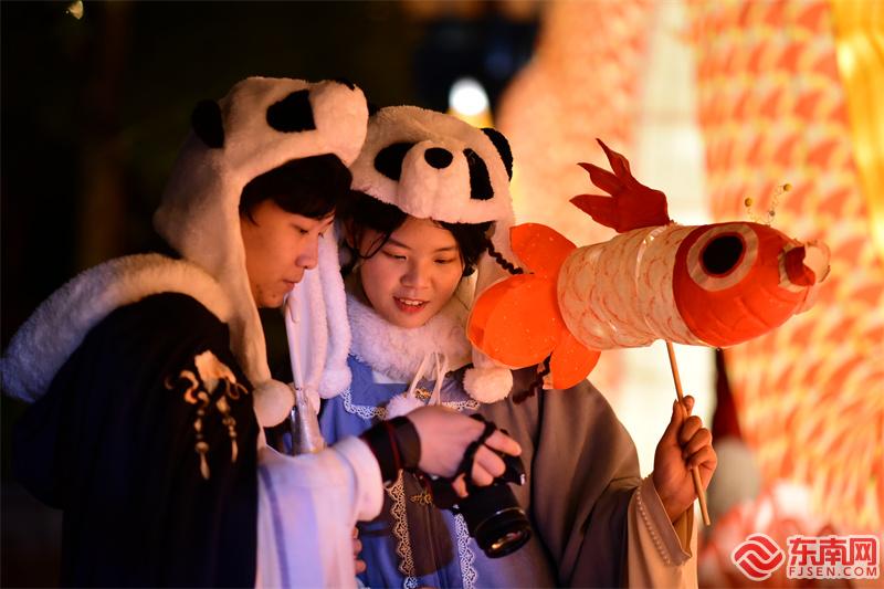 游客体验汉服着装。沈伟彬 摄 此外,“两岸一家亲”灯组以并蒂花为主题,展现两岸同心相连、心手相牵的图景,而作为两岸民众共同的文化纽带,妈祖是两岸民众的精神纽带,现场8米高的妈祖花灯,在流光溢彩的荷花花灯中为民众送福,祈愿来年风调雨顺。 值得一提的是,主办方首次将“福文化”元素引入灯会,灯会相关负责人表示,千百年来,两岸同胞各种形式传承和演绎着福文化,在喜庆的新春佳节更是“福文化”的生动演绎,园区内大大小小的“福”也将为活动增添亮色。 23组特色灯组,分别坐落于园区内的各个景点,错落有致。哪吒闹海、梁祝等将中华传统的故事融入其中,让灯光与造型联动;颇具节日氛围感的造型灯组也错落有致地遍布园区,层次分明;南瓜马车则以融入了高科技的人像互动模式,吸引许多孩子排队打卡,游园其中,无论是大人孩子都能在发现传统美的同时,找到乐趣。 园区浓厚闽南气息的建筑,在灯光的映衬下颇具风味。长长的灯谜阵,已在厦门工作生活多年的台青金于峰不禁举起手机,定格美好。他说,这里的气候和人物环境都很有亲切感。得知有两岸灯会,他特意前往。“厦门有相似的年味。”金于峰表示,灯会中两岸元素很多,观赏时能时刻发现融合在其中的惊喜和巧思,设计得很用心,“氛围感十足”。