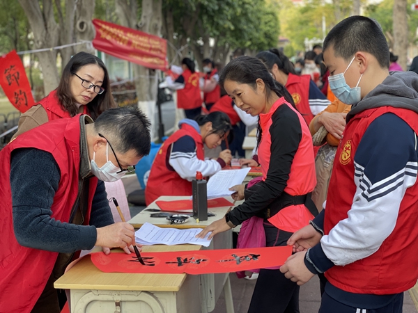 1月19日下午,三秀社区新时代文明实践站乡风文明志愿服务队联合杏南中学师生开展“喜迎新年写春联·情暖社区送祝福”的活动。