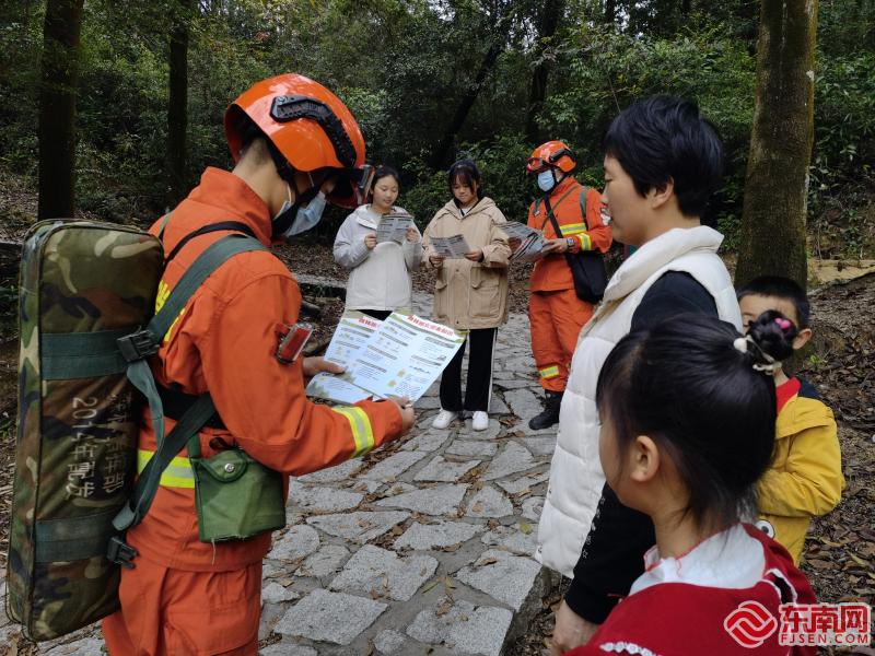 2月5日,福建省森林消防总队厦门市驻防分队消防救援人员在厦门市天竺山国家森林公园防火执勤岗位上,引导入山游客做好入山登记,并向游客宣讲防火知识。