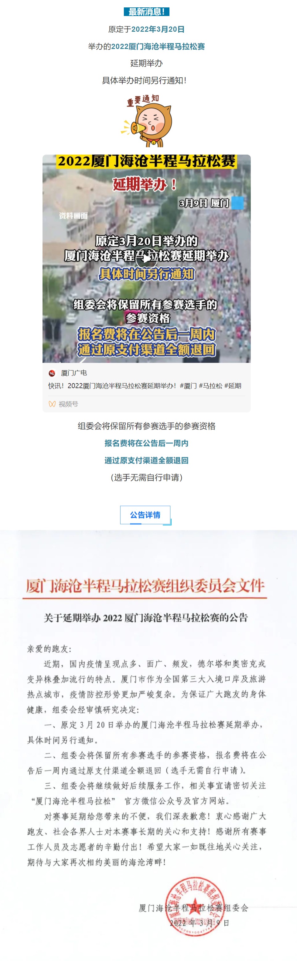 2022海沧半程马拉松赛延期举办 将保留选手参赛资格