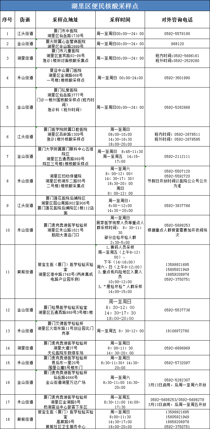 为方便广大市民核酸检测,自3月13日19时至3月31日24时,厦门市设置157个便民核酸采样点,免费为市民群众进行“10混1核酸检测”。当前,湖里区共设有23个核酸检测采样点。