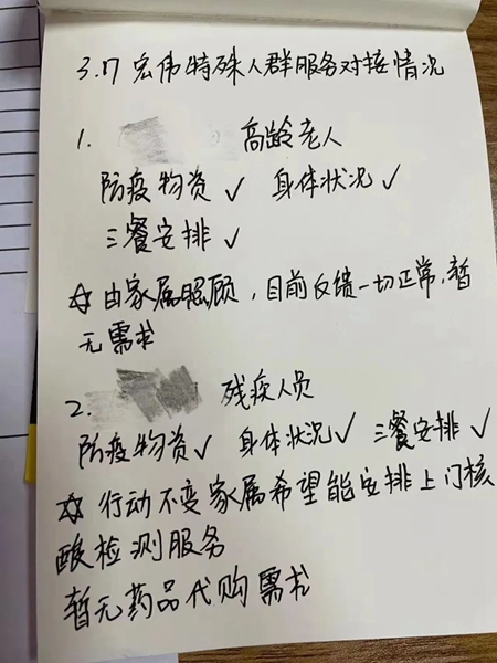 志愿者接电话记录群众诉求。(湖里区融媒体中心供图) “孩子年纪小免疫力差,可以麻烦医生上门核酸吗?” “原定手术因为封控推迟,我该怎么办?” “突然封控,很担心家里的老人。” …… 在一线封控指挥部的办公室内,2部爱心专线电话的铃声不停响起,志愿者耐心地将电话那头的求助信息一一记下,再分配给不同的职能部门快速处理。 从白天到黑夜,这两部24小时在线的电话,成为宏伟大厦内被封控群众排忧解难、缓解焦虑的爱心通道。老人、孕妇、孩子、病人……在电话的背后,是封控指挥部和禾山街道、禾盛社区无微不至的关怀。