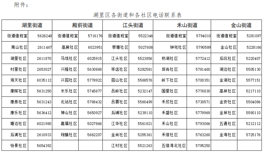 3.落实责任。 (1)各企事业单位(含商事主体)要落实单位主体责任,督促返厦员工,特别是2月27日(含)以来有泉州旅居史的员工,立即向所在社区报告,按社区要求进行核酸检测并及时报告检测结果。因病缺勤、离厦员工复工时,应持有48小时核酸阴性报告。要严格督促相关员工落实居家健康管理要求,指定专人每日跟踪有关情况,收集汇总上报企业所在社区。 (2)各房东要落实相应租户管理主体责任,认真排查租户信息,核实租户核酸检测结果,协助社区抓好租户健康管理,发现租户有不良症状或疑似非法入境等情况,及时向社区报告。 (3)各责任主体要严查“三码”,即扫场所码、验健康码、查行程码,严格督促“应检尽检”“适时抽检”管理对象落实核酸检测,确保做到“全覆盖”。 4.做好防护。 此轮疫情隐匿性强,具有高传染性。 (1)广大居民朋友,不论何时何地都要高度重视做好“戴口罩、一米线、不扎堆、勤洗手”等个人防护要求。 (2)尽量减少出入各类公共场所次数和逗留时间,如确需进入公共场所,要主动配合管理人员落实扫码验码、查行程码、人员分流等防疫措施。 (3)乘坐公共交通工具时,务必全程佩戴口罩,途中尽量避免用手触摸车上物品。 (4)在疫情防控一线开展检查、督查及参与核酸检测、卡口值守等活动时的工作人员,更要严格做好自我防护。 (5)主动接种疫苗,积极构建防疫屏障。 疫情防控,人人有责!感谢大家的理解、支持与配合! 附件:湖里区各街道和各社区电话联系表