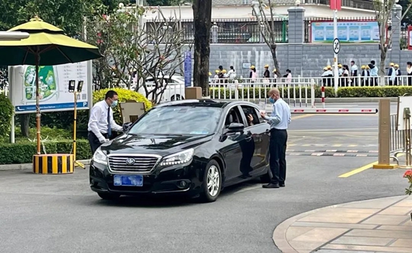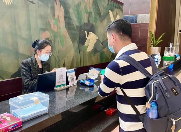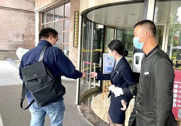 除了司机外,车上还有3名随行人员,保安对他们采取了同样的操作。待车停稳后,这4名旅客准备步入酒店大堂时,还需要进行一次体温测量,确认体温合格后,才能来到前台,办理入住手续。