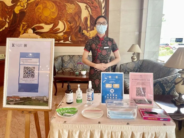 在酒店大堂内,随处可见有关疫情防控的相关标语和通告,门岗、大堂入口、前台,还整齐摆放了免费的口罩,方便有需要的旅客。