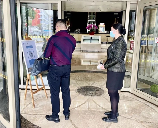点赞防疫好做法,直面问题补短板。 3月17日,厦门市湖里区融媒体中心联合海西晨报社推出“湖里防疫红黑榜”融媒体特别策划报道后,引起了湖里区居民群众的广泛关注,得到了全市各界的点赞与认同。 记者还将继续深入湖里区疫情防控一线,通过实地走访调查的方式,聚焦湖里区从严抓好疫情防控的努力和成效,客观反映短板与不足,助力打好疫情防控组合拳,坚决阻断疫情传播。 红榜 悦华酒店 不留任何一个防疫漏洞 “您好,请出示健康码、行程码,然后扫描张贴码、测量体温。” 3月18日上午11点半,一辆汽车停在了厦门悦华酒店东门,保安立即进行防疫检查。