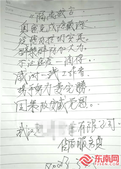 罗先生写给医务人员的诗(受访者供图) 入住当晚,罗先生就挥笔写下诗句以表达自己内心的感谢——“奥密克戎隐藏深,疫情防控切实真。群策群防加大力,不让瘟疫一滴存。感谢一线工作者,携手努力要完胜,国策政安感党恩。” 写完诗,罗先生迫不及待地发给了青逸酒店医疗组组长、后溪镇卫生院妇产科副主任李兰。当天,由李兰负责罗先生的健康管理工作。除了核酸检测和体温监测,因为无法面对面交流,她通过电话为罗先生解答疫情防控问题,安抚他的焦虑情绪。 李兰说,看到诗句的当下感到有些惊讶,在她看来,大家不过做了分内的事情。她告诉记者,目前,青逸酒店医疗组总共有8名医务人员,来自集美区妇幼保健院、后溪镇卫生院。医务人员除了完成日常核酸采样的同时,还为入驻人员提供健康管理工作,特别针对患有基础疾病的特殊人群提供用药指导等。