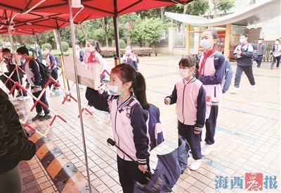 昨日早上,厦门市翔鹭小学学生返校上课。记者 唐光峰 摄 海西晨报讯(记者 许蔚菡 谭雅环 林夏悦 唐光峰)淅沥的小雨,激动的心情,久违的校园,兴奋的“神兽”。居家学习一周后,昨天,厦门60余万名中小学生返校上课。恰逢“全国中小学生安全教育日”,不少学校不仅温馨布置了欢迎回校的标语,还安排了安全教育课,让孩子们“知危险、会避险”。 校长一早等候 欢迎学生返校 昨日,滨东小学校长王跞早早地带领行政人员、导护老师和防疫小义工,在校门口等候。同学们戴着口罩,保持间隔,在接受体温检测后,陆续走进校园。现场设置了四条文明通道,全校26个班共1313名学生分三批次错峰入校。 滨东小学关注学生的心理调适,门口LED屏幕、班级的黑板上有“孩子们,欢迎回家”“疫散花开,线下乐欢聚”等暖心话语。防疫心理组为孩子们带来了精心设计的“心理第一课”。 昨日早上,厦门市翔鹭小学书记、校长陈春梅,湖里交警大队殿前中队民警孙军海和学校导护老师在校门口迎接返校上课的学生。第一堂课,学校以“缅怀先烈,自强不息”为主题,结合疫情防控,带领孩子们向在防控中有突出贡献的医护人员学习,传承“逆行者”的精神。学校已完成全员核酸检测、复课物资保障、校园环境消杀等工作。 此外,东渡第二小学学生也自觉遵守“1米线”入校,井然有序,防疫学习两不误;湖里区进修二附小组织了以“处处有隐患 时时讲安全”为主题的复学仪式,各班纷纷开设快乐复学课堂。 根据疫情防控相关要求,这段时间,恢复线下教学的学校每天将抽取20%的师生员工进行一次核酸检测,本周完成全员一轮核酸。这一周,学校将结合线上教学情况,通过学情分析、课堂观察、课堂练习、家访谈话等形式,分层、分步推进教学衔接,扎实做好线上线下教学的无缝衔接。校园一律实行封闭管理,严禁任何无关人员进入校园;上下学途中,实行家校点对点接送,确保学生“两点一线”。家长接孩子需全程佩戴口罩,尽量通过步行或私家车接送孩子。 分别一周相见 孩子倍感兴奋 昨日7时30分,床头的闹钟准时响起,厦门市人民小学鼓浪屿校区六年(2)班的刘轩麟吃完早餐,背上书包,步行上学。对他来说,居家学习意味着有更多时间做妈妈的小帮手。返校后,刘轩麟将参加航模社团和版画社团,并在他最爱的学校图书馆里,自助借阅图书,遨游书海。“见到分别一周的同学,真好。” “我5时50分起了床,这样早晨就会有一大段完整的时间可以在地铁上复习,非常充实。”昨日,双十中学初三学生简千怀起了个大早,返校上课。中午,简千怀留在学校跟同学们一起吃饭,有小伙伴的陪伴,简千怀吃得特别香。“接下来这几个月时间非常宝贵,希望可以和同学们一起在学校度过。”简千怀说。 人民小学鼓浪屿校区的何鹭萍老师告诉记者,此前一周,班级的作业以线上收集形式进行,大多数同学能认真地按要求完成作业,及时修正错处。不少老师表示,线下教学,学生有更充足的时间思考与表达,课堂互动更充分,老师也更能关注到一些学习有困难的同学。 |