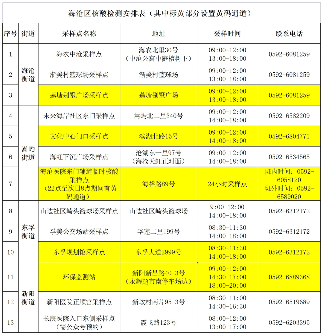 东南网3月31日讯(本网记者 卢超颖)3月31日,厦门市海沧区应对新冠肺炎疫情工作指挥部发布紧急通知,要求所有外地入厦来海沧和本地外出返厦人员入海沧后,必须马上就近落实1次核酸检测,连做3天,并主动向社区或所在单位报告。全区各企事业单位必须督促本单位外出员工落实相应核酸检测。 通知要求,村(居)、小区卡口查验行程码时,发现外地入厦必须同时查验核酸检测情况。 3月31日,海沧区安排13个便民核酸检测采样点,其中海沧医院是24小时核酸采样点。以下黄色点位设置有黄码人员专用检测通道(海沧医院只有22时到次日8时有安排黄码检测通道)。