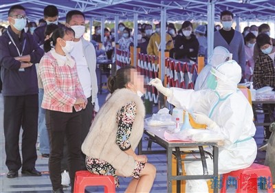 在厦港街道核酸检测点,医护人员为市民采样。记者 唐光峰 摄