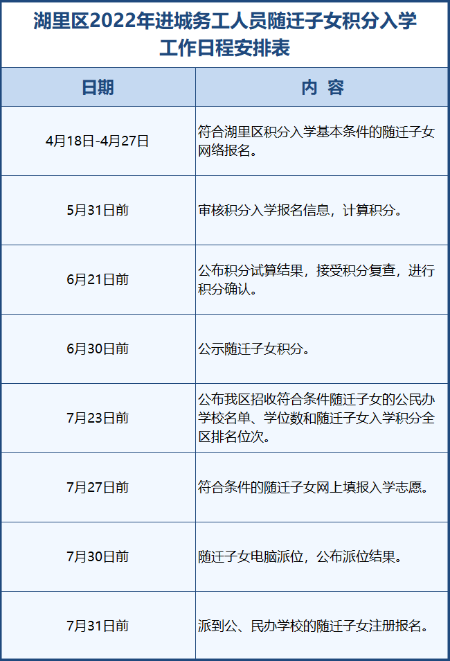 为贯彻落实《厦门市教育局关于印发厦门市2022年秋季小学招生工作意见的通知》(厦教发〔2022〕23号)的精神,完善湖里区义务教育阶段学校的招生办法,2022年湖里区坚持“量力而行、尽力而为”的原则,按照国家规定的班生额标准提供学位,采取积分入学和电脑派位相结合的办法,科学合理、公开公平地开展进城务工人员适龄随迁子女(以下简称随迁子女)就读湖里区小学一年级的工作,具体实施细则如下: 积分入学基本条件 申请参加湖里区积分入学的随迁子女必须同时符合以下基本条件: (一)随迁子女应年满六周岁,即2015年9月1日至2016年8月31日期间出生。 (二)随迁子女父(母)持有在有效期内的居住地住址在湖里区的福建省居住证。 (三)随迁子女父(母)报名前在湖里区连续居住6个月以上,即2021年11月1日-2022年4月30日必须在湖里区居住。 积分计算方法 随迁子女小学积分入学按务工社保积分58分、稳定居住积分57分两个项目计算积分,满分为115分。具体积分项目和分值如下: (一)务工社保积分,本项满分58分 1.随迁子女父(母)(主申请方)在工作单位参加厦门市社会保险累计每满一年(12个月)积4分,不足一年的,按实际月份/12个月*4分计算得分,以按时缴交的月份累计计算,补缴的月份不纳入计算,本项满分48分。 2.随迁子女父母双方均在厦门居住(副申请方需在2022年4月30日前有在厦居住记录或暂住记录,且当前有效)、务工和参加社会保险的,可以一方作为主申请方计算积分,另一方作为副申请方。副申请方在厦参加社会保险的年限按每满一年(12个月)积2分,不足一年的按实际月份/12个月*2分计算得分,以按时缴交的月份累计计算,补缴的月份不纳入计算,本项满分10分。 (二)稳定居住积分,本项满分57分 1.随迁子女父(母)(主申请方)在厦门市居住累计每满一年(365天)积2分,不足1年的,按照实际天数/365天*2分计算得分,本项满分24分。 2.随迁子女父(母)在湖里区购置符合成套居住条件的商品住房(房屋用途应为“住宅”)并实际入住,且其父(母)所占房屋产权的比例合计超过50%(不含50%)的,积24分。拥有多套房产的按其中一套计算。 3.随迁子女父(母)一方(主申请方)居住地与社会保险缴交单位注册地均在湖里区的,累计每满一年(12个月)积1分,不足12个月的,按符合条件的实际月份/12个月*1分计算得分,以社会保险按时缴交的月份累计计算,补缴的月份不纳入计算,本项满分9分。 说明:在湖里区购置超过50%(不含50%)产权比例的符合成套居住条件的商品住房(房屋用途应为“住宅”)的随迁子女父(母),可凭借其本人(或配偶)在湖里区购买房屋的产权证登记时间与其办理居住证(或暂住证)的时间合并计算在厦居住时间。以产权尚在随迁子女父(母)名下的房屋计算,已经出售或变更产权归属的不纳入计算。 同分排序 总积分相同的随迁子女,依次按以下项目积分进行同分排序:购房、社保年限、居住年限。若按上述项目同分排序后积分名次仍相同的,则排名并列,电脑派位时按随机的原则进行派位。 工作程序 (一)实名注册,网上报名 (4月18日-4月27日) 符合参加湖里区积分入学基本条件的随迁子女需在报名前登录“i厦门”一站式综合服务平台(https://ixm.xm.gov.cn/)或关注“i厦门”微信公众号进行实名注册,并于4月18日-4月27日期间在“i厦门”一站式综合服务平台的“积分入学”栏目或通过“i厦门”微信公众号进行网上报名,填写准确的个人信息。逾期未进行网上报名的,均视为自动放弃在我区参加积分入学的资格。 (二)系统审核,计算积分 (5月31日前) 积分入学报名系统根据申请人填报的个人信息自动调取申请人的居住、缴交社会保险等信息进行审核并试算积分。 (三)公布积分试算结果,积分确认 (6月21日前) 湖里区教育局将于6月初公布积分试算结果及积分确认方式。具体积分试算结果公布时间及积分确认方式和时间段将在湖里区政府网站和“湖里教育”微信公众号公布。积分确认时间段以积分确认公告为准,逾期未进行积分确认的,均视为自动放弃在我区参加积分入学的资格。 (四)公示积分 (6月30日前) 6月30日前,区教育局公示经审核符合条件的随迁子女的入学积分,公示期5个工作日,接受监督。随迁子女家长如对积分计算有异议的可在公示期内向区教育局等相关部门提出复核的申请,逾期不予受理。若对积分入学工作有其他异议的,可向中共湖里区委教育工委或厦门市教育局基础教育处投诉反映。 (五)公布积分全区排名位次及学位情况 (7月23日前) 7月23日前,区教育局公布本区招收符合条件随迁子女的公办与民办小学名单、招生名额和经审核符合积分入学基本条件的随迁子女入学积分在全区的排名位次。 (六)填报志愿 (7月27日前) 7月27日前,经审核确认符合条件的随迁子女进行网上志愿填报,逾期未填报视为自动放弃在我区参加积分入学的资格。 (七)派位入学 (7月30日前) 7月30日前,区教育局按照“积分优先、遵循志愿”的原则,对符合条件的随迁子女根据积分排序位次和填报的志愿顺序,以电脑派位的方式派入我区的公、民办小学,派完学位为止。派位结果向社会公布。电脑派位结果查询时间和方式将通过“湖里教育”微信公众号另行通知。 (八)派到公、民办学校的随迁子女注册报名 (7月31日前) 7月31日前,派到公、民办学校的随迁子女请携带户口本原件和复印件等相关材料到所派学校领取