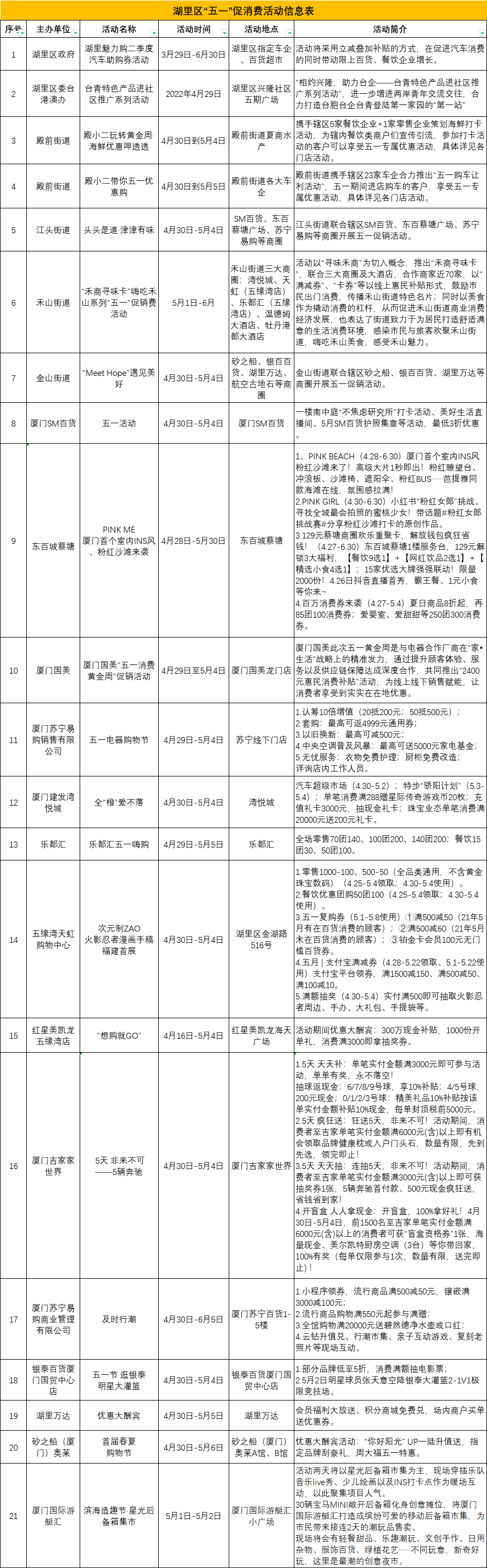 湖里区各大商圈联动发力 超多福利 优惠预告 第一波商超活动来袭~ 快来湖里释放你的消费热情 让我们一起喜迎五一! ꔷ SM百货 ꔷ 4月30日-5月4日 ①化妆品1000-100(4/30-5/4) ②镶嵌折上9.5折 ③国产表7.7折 ④鞋服3折起/内衣5折-7.7折 ⑤一楼南中庭“不焦虑研究所”等你来打卡 ⑥美好生活直播间 ⑦5月SM百货护照集章活动 ⑧SM会员消费即可尊享5倍积分 ⑨SM一二期全场当日累计消费满500元,即可参与抽奖;当日累计消费满1500元,甄选好礼随心兑! ⑩消费599元,可参与转盘抽奖,获百元购物卡。 ⑪兴业银行兴享惠小程序美食5折起 ⑫招商银行-掌上生活APP美食5折起 ⑬滴滴出行BUFF以SM为起终点,优惠出行6.6折起 ⑭嘀嗒出行BUFF,以SM为起终点即可享受20元无门槛券包 ꔷ 湾悦城 ꔷ 4月30日-5月4日 全“橙”爱不落 ①汽车超级市场(4/30-5/2) ②特步“骄阳计划”(5/3-5/4) ③单笔消费满288赠星际传奇游戏币20枚 ④充值礼卡3000元,抽现金礼卡 ⑤珠宝业态单笔消费满20000元送200元礼卡 ꔷ 五缘湾天虹 ꔷ 4月30日-5月4日 次元制ZAO 火影忍者漫画手稿福建首展 1、零售1000-100、500-50(全品类通用,不含黄金珠宝数码) 领取:4.25-5.4 使用:4.30-5.4 2、餐饮优惠团购50团100 领取:4.25-5.4 使用:4.30-5.4 3、五一复购券 使用:5.1-5.8 ①满500减50 (21年5月有在百货消费的顾客) ②满500减60 (21年5月未在百货消费的顾客) ③铂金卡会员100元无门槛百货券 4、五月 | 支付宝满减券 领取:4.28-5.22 使用:5.1-5.22 支付宝平台领券,满1500减150/满500减50/满100减10 5、满额抽奖 活动:4.30-5.4 实付满500即可抽取火影忍者周边,手办,大礼包,手提袋等 ꔷ 湖里万达 ꔷ 4月30日-5月5日 优惠大酬宾 会员福利大放送 积分商城免费兑 场内商户买单送优惠券 ꔷ砂之船(厦门)奥莱ꔷ 4月30日-5月6日 首届春夏购物节 地点:砂之船(厦门)奥莱A馆、B馆 优惠大酬宾活动: “你好阳光” UP一陆升值送 指定品牌刮豪礼 周大福五一特惠 ꔷ 东百城蔡塘 ꔷ 4月28日-5月30日 PINK ME 厦门首个室内INS风粉红沙滩来袭 ①4.28-6.30→PINK BEACH 厦门首个室内INS风粉红沙滩来了!高级大片1秒即出!粉红瞭望台、冲浪板、沙滩椅、遮阳伞、粉红BUS ~芭提雅同款海滩在线,氛围感拉满! ②4.30-6.30→PINK GIRL 小红书“粉红女郎”挑战 寻找全城ZUI会拍照的蜜桃少女!带话题#粉红女郎挑战赛#分享粉红沙滩打卡的原创作品 ③4.27-6.30→129元蔡塘商圈欢乐重聚卡,解放钱包疯狂省钱! 地点:东百城蔡塘 1楼服务台蔡塘商圈欢乐重聚卡, 129元解锁3大福利,【餐饮9选1】+【网红饮品2选1】+【精选小食4选1】;15家优选大牌强强联动!限量2000份!4.26日抖音直播首秀,霸王餐、1元小食等你来~ ④百万消费券来袭 4.27-5.4夏日商品8折起,再85团100消费券;爱婴室、爱甜甜等250团300消费券。 ꔷ 厦门国际游艇汇 ꔷ 5月1日-5月2日 滨海造趣节·星光后备箱集市 活动两天将以星光后备箱市集为主,现场穿插乐队音乐live秀、少儿绘画以及INS打卡点作为暖场互动,以此聚集项目人气。 30辆宝马MINI敞开后备箱化身创意摊位,将厦门国际游艇汇打造成缤纷可爱的移动后备箱市集,为市民带来接连2天的潮玩品售卖。 现场将会有轻餐甜品、乐趣潮玩、文创手作、日用杂物、服饰百货、绿植花艺……不同玩意,新奇好玩,这里是最潮的创意夜市。 ꔷ 厦门国美 ꔷ 4月29日至5月4日 厦门国美 “五一消费黄金周”促销活动 地点:厦门国美龙门店 厦门国美此次五一黄金周是与电器合作厂商在“家•生活”战略上的精准发力,通过提升顾客体验、服务以及供应链保障达成深度合作,共同推出“2400元惠民消费补贴”活动,为线上线下销售赋能,让消费者享受到实实在在地优惠。 ꔷ 厦门苏宁易购 ꔷ 4月30日-5月4日 五一电器购物节 ①认筹10倍增值(20抵200元;50抵500元) ②套购:最高可返4999元通用券 ③以旧换新:最高可减500元 ④中央空调普及风暴:最高可送5000元家电基金 ⑤无忧服务:衣物免费护理;厨柜免费改造 详询店内工作人员 4月30日-6月5日 及时行潮 ①小程序领券,流行商品满500减50元,镶嵌满3000减100元; ②流行商品购物满550元起参与满赠; ③全馆购物满20000元送碧然德净水壶或口红; ④云钻升值兑、行潮市集、亲子互动游戏、复刻老照片等现场互动。 ꔷ 乐都汇 ꔷ 4月29日-5月5日 乐都汇“五一”嗨购 全场零售:70团140;100团200;140团200; 餐饮:15团30;50团100 ꔷ 银泰百货 ꔷ 4月30日-5月4日 “五一”节 逛银泰 ①部分品牌低至5折单笔消费满51元抽电影票; ②大型银小泰IP空降银泰百货,还有一堆的熊出没,五一快来银泰百货厦门国贸中心店打卡呀! ꔷ红星美凯龙五缘湾店ꔷ 4月16日-5月4日 “想购就GO” 地点:红星美凯龙海天广场 活动期间优惠大酬宾:300万现金补贴,1000份开单礼,消费满3000即拿抽奖券。 ꔷ 厦门吉家家世界 ꔷ 4月30日-5月4日 5天 非来不可 ——5辆奔驰 ①5天 天天补:单笔实付金额满3000元即可参与活动,单单有奖,永不落空! 抽球返现金:6/7/8/9号球,享10%补贴;4/5号球,200元现金;0/1/2/3号球:精美礼品10%补贴按该单实付金额补贴10%现金,每单封顶税前5000元。 ②5天 疯狂送:狂送5天,非来不可!活动期间,消费者至吉家单笔实付金额满6000元(含)以上即有机会领取品牌健康枕或入户门头石,数量有限,先到先选,领完即止! ③5天 天天抽:连抽5天,非来不可!活动期间,消费者至吉家单笔实付金额满3000元(含)以上即可获抽奖券1张,5辆奔驰首付款、500元现金疯狂