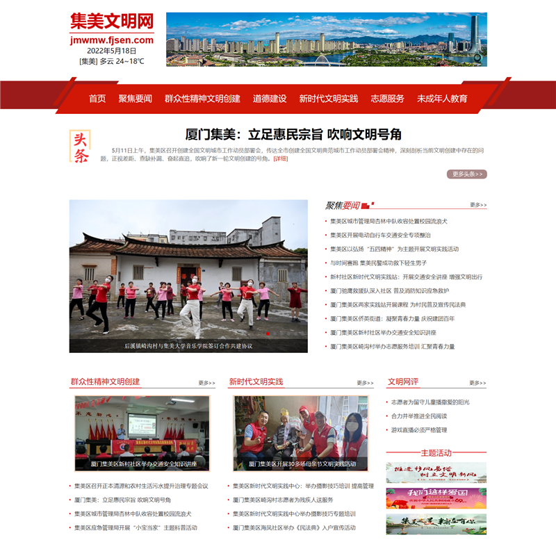 5月18日,由厦门市集美区委文明办主办、东南网承办的集美文明网全新改版上线。本次改版,网站以更清新、大气的页面设计,更简洁、流畅的浏览体验,更丰富、多元化的栏目内容,多维度展示集美区精神文明建设累累硕果,打造“集文明之美 扬时代新风”的文明宣传线上平台。