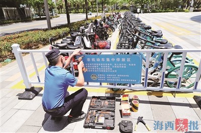 执法人员自带工具维修指示牌。记者 陈理杰 摄 海西晨报讯(记者 周莉)今年四月以来,厦门四部门联合发力在全市范围内开展电动自行车综合治理。通过充分的宣传引导、精细管理与贴心服务,思明区城管局用柔性执法强化市民文明停车意识,解决群众电动自行车停放问题,引导更多市民共同维护整洁市容。 近日,记者在安费诺电子装配(厦门)有限公司大门外看到一片停车区,既满足了员工和周边居民停车需求,也避免了安全隐患,而这片停车区正是在思明区城管局莲前中队协调、指导下划设的。“辖区地铁、BRT站点集中,社区非机动车数量大,服务一定要做在前面。”莲前中队中队长周小敏介绍,电动自行车综合整治以来,中队借鉴以往成熟经验,不断加强推广,先后引导辖内企业完成21处停车区域建设,完成18处交通枢纽站点停车区域建设。 此外,为加强宣传督导,思明区城管局制订了《非机动车停放的有关规定》;执法人员进企业、商圈等人流密集区向员工、居民宣传有关规定,巡查时发现骑行人违规停车也会耐心劝导。为培育骑行人文明停车习惯,执法人员还广泛设置立牌标示,在交通枢纽站点等地设置非机动车辆集中停放标示牌,设置非机动车辆禁停标示,在拥堵地段路面上喷划“禁止停车”标示字、围栏上悬挂“违停处罚”提示牌。这些提示牌如果出现螺丝松动等情况,执法人员还会带上扳手、螺丝刀等各种工具,自己动手进行修补。 |