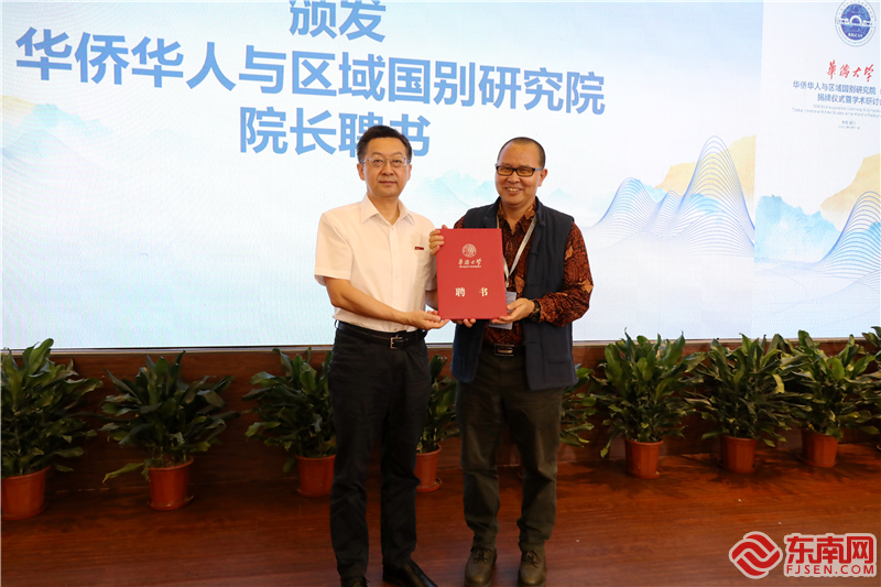 华侨大学党委书记徐西鹏向吴小安教授颁发院长聘书(华侨大学供图) 揭牌仪式后,三位不同学科背景的著名学者受邀作了精彩的主旨报告。复旦大学文科特聘资深教授葛兆光、德国马克斯·普朗克社会人类学研究所暨牛津大学人类学教授项飙、华侨大学讲席教授庄国土分别以《为什么东部亚洲海域可以成为一个历史世界》《再生产的人口流动》《21世纪初期世界华侨华人的新变化》作报告。三位重量级学者的主旨报告深刻生动,从各自专业领域的视角出发,对我国华侨华人与区域国别研究提出了许多真知灼见。华侨大学讲席教授、华侨华人与区域国别研究院院长吴小安主持了主旨报告会。 当天下午的研讨会,分为两场平行论坛和一场圆桌论坛,北京大学、清华大学、中国社会科学院、南京大学、中山大学、浙江大学、厦门大学、东北师范大学、云南大学、暨南大学、上海师范大学、中国现代国际关系研究院等全国重点高校、科研院所,以及福建省社会科学院、福州大学、福建师范大学、嘉应学院等地方高校和研究机构的学者线上或线下参加研讨,畅谈区域国别学的学科建设,展望学科建设的未来和发展趋势。 区域国别学是我国新兴的交叉学科。把华侨华人研究与区域国别研究相结合,既是吴小安讲席教授的创举,亦是华侨大学的研究特色所在。研究院聘请10位来自新加坡、美国、日本、英国、德国等国的知名学者担任国际咨询委员会委员。研究院拟设立全球中国与华侨华人群、中华文明与华侨华人群、亚太区域与华侨华人群、比较移民与华侨华人群、印度洋区域与华侨华人群、侨乡文化与华侨华人群等六大研究群,汇聚海内外知名学者和青年才俊,聚焦重大理论和实践问题开展深入研究,努力建设成为国际知名、高水平的华侨华人问题研究院。