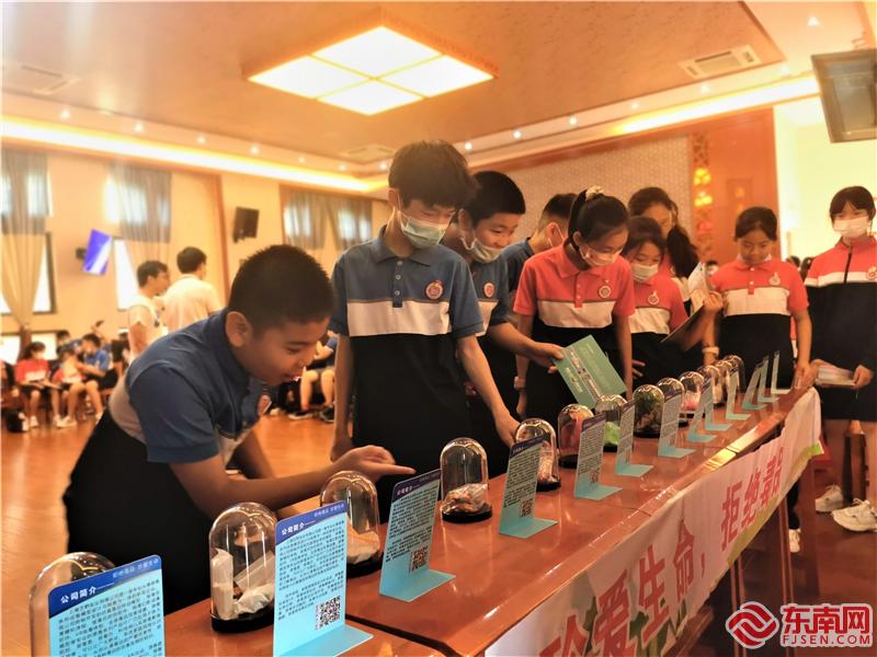 五缘实验学校园博分校禁毒活动现场,小朋友们在观摩仿真毒品。(熊子婕 摄)