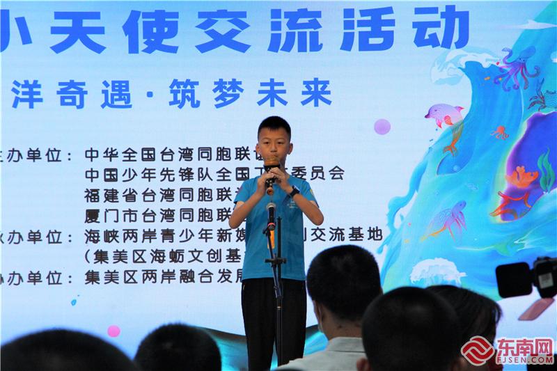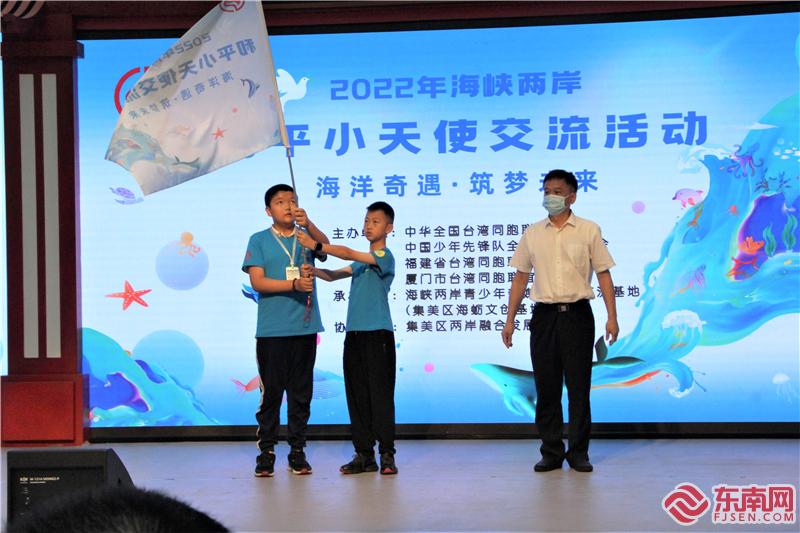 2022年海峡两岸和平小天使交流活动开营仪式现场 东南网记者 李霖 东南网7月3日讯(本网记者 李霖)7月3日上午,“海洋奇遇,筑梦未来”2022年海峡两岸和平小天使交流活动在厦门市集美区启幕,30名两岸小天使共同开启为期两天的海洋研学之旅,收获知识、友谊,筑梦白鹭洲。 作为全国台联的品牌项目之一,海峡两岸和平小天使交流活动自1992年以来,在两岸各界的共同努力下,成功举办了17届,走遍了全国十几个省市自治区,直接参与其中的两岸小天使超过了2300人,涉及2000多个家庭。 中华全国台湾同胞联谊会副会长郑平云端致辞表示,本次活动依托闽台两岸得天独厚的海洋条件,开展海洋文化知识探索,从海洋为源点出发,让小天使们深刻理解一衣带水的闽台两岸密不可分。 开营仪式上,福建省台联副会长苏甦为两岸小天使交流团授旗。小天使们庄重宣誓——将积极参加本次研学旅行活动,遵守纪律、团结有爱、拓展视野、丰富海洋知识,实现中国梦!他们还共同演唱了和平小天使主题曲《同是一个梦》。 活动现场,两岸小天使和嘉宾们共同欣赏了非遗文化传承人带来精彩的木偶戏表演。孩子们也踊跃上台,送上了街舞表演、葫芦丝演奏。“长大成才,建设祖国,中国的梦,我们的梦!”宁宝小学三年级的台湾学生邱苡乔深情朗诵《少年中国梦》。她告诉记者,能参加这次海峡两岸和平小天使交流活动,跟两岸小朋友们共同“探索海洋”,“觉得既兴奋又激动!”