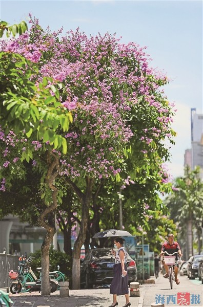 仙岳路上,大花紫薇盛开。记者 陈理杰 摄 海西晨报讯(记者 彭怡郡)一簇簇淡紫色的花朵迎风绽放,使道路两旁仿佛披上了一条淡紫色的绸带……连日来,记者在厦门仙岳路、厦禾路、金榜路等地,都看到了花开正盛的大花紫薇。 大花紫薇被誉为“行道树中的美女”,花开时灿若烟霞,好似给喧闹的城市披上了一层“紫纱”。记者发现,仙岳路道路两旁的大花紫薇娇媚而显眼,蓝紫色花串绽放于枝头,花朵摇曳时枝叶窸窣,如娇羞少女掩面衣袂翩翩,美不胜收。 金榜路上,记者也邂逅了灿烂的大花紫薇,一簇簇紫色花朵堆于枝头,花瓣不时飘落在树下熙熙攘攘的人群中。这里的大花紫薇,淡雅花香带来一树清凉,好似吹散燥热的暑气,让夏日街巷更增添几分梦幻感。 “谁道花无红百日,紫薇长放半年花。”据了解,大花紫薇不与百花争春,花期从5月持续到9月,一般在6月和7月进入盛花期。在厦禾路的莲坂国贸站、双涵路口附近,以及图强路、湖光路、莲前西路、枋钟路、文曾路等多个路段,市民同样也能看到大花紫薇聚花成球,绚丽绽放。 |