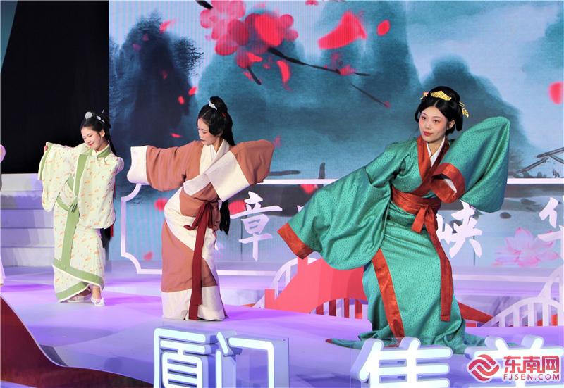 伴着悠悠南音,华服舞者踏歌而来,12日晚,2022海峡青年华服节“最美环节”——“盛宴归鹭,华美云集”海峡两岸华服主题T台秀在线上线下同步上演。