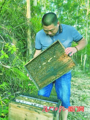 蜂农在检查蜂箱。 厦门日报讯(记者 薛尧 实习生 潘文婧)厦门高温天气已持续多日,对蜜蜂养殖行业产生了不小的影响。记者走访翔安区新圩镇的蜜蜂养殖场了解到,此前的强降雨加上最近的高温天气,导致蜂蜜减产。 7月21日下午3点左右,记者来到翔安区新圩镇古宅村,在贺邦溪养蜂场山上的树林里,记者看到蜂箱整齐排列在树荫下。据养蜂场负责人黄江水介绍,园区有150箱蜜蜂,每个蜂箱可养殖约18000只蜜蜂,蜜蜂需要避暑,会将蜂箱分散放开,每个蜂箱放约9000只。 “今年夏天蜜蜂的繁殖情况不太乐观,高温导致蜜蜂死了不少,现在一个蜂箱只有约6000只蜜蜂,蜂王也没有生出足够数量的蜜蜂。”黄江水告诉记者,天气过于炎热会影响蜜蜂的繁殖,超过35℃蜂王就会停止产卵,现在正处于蜂群“青黄不接”的状态。受此影响,农场的经济损失达3万元至5万元。 “前几年的夏天,还能采1到2次蜂蜜,今年夏天以来还没采到。”黄江水对记者说,除了受高温影响,前段时间接连不断的雨水天也是导致蜂蜜减产的另一个重要原因。外界没蜜源导致蜂群退化,受雨水影响,蜜蜂采来的花蜜也都含有大量的水,蜂蜜质量大打折扣。 “如今只能给蜂王喂食一些白糖,刺激它产卵。”黄江水表示,此外也要给蜜蜂解暑降温,将蜂箱都移到树下阴凉处,还需把隔热防光纸或泡沫盖放在蜂箱上,甚至要往蜂箱上洒水降温。 |