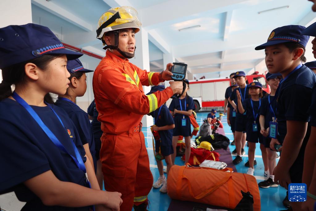 7月25日,在福建省厦门市集美区北站消防救援站,消防员向小学生们讲解消防器材装备的使用方法和用途。新华社发(曾德猛摄)
