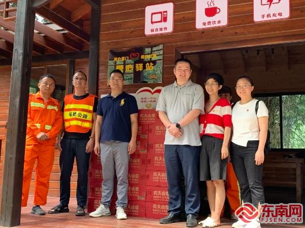 东枧线山区公路上的爱心驿站(厦门公路事业发展中心供图) 东南网8月3日讯(本网记者 刘玮 通讯员 陈佳妮)2021年夏天,厦门市民刘晓东与同事们去军营村开展党建活动,途中来到了东枧线山区公路上的“交通一家亲”爱心驿站。一年过去了,刘晓东始终记挂着默默付出的养路工人们及这座“小木屋”。8月2日上午,刘晓东和同事们带着农夫山泉和藿香正气水再次来到了爱心驿站。 去年夏天,由于些许疲乏与好奇心驱使,他们便走进“小木屋”一探究竟。只见“小木屋”内外收拾得整洁干净,配备有空调、微波炉、饮水机、充电器等服务设施一应俱全。专职驻站人员詹春东为刘晓东端上一杯清茶,并简单介绍了爱心驿站的用途。因有感于养护工人的辛劳付出与公路人的大爱,不久后,他与同事们向爱心驿站捐赠了一批矿泉水、藿香正气水等爱心物资。