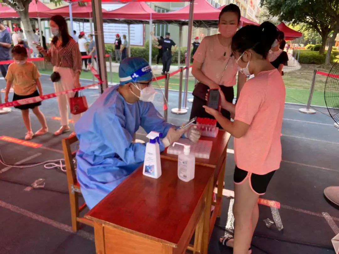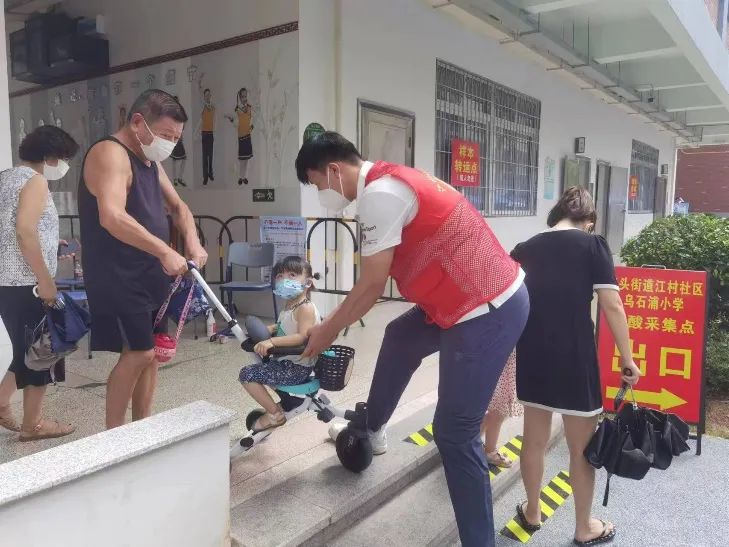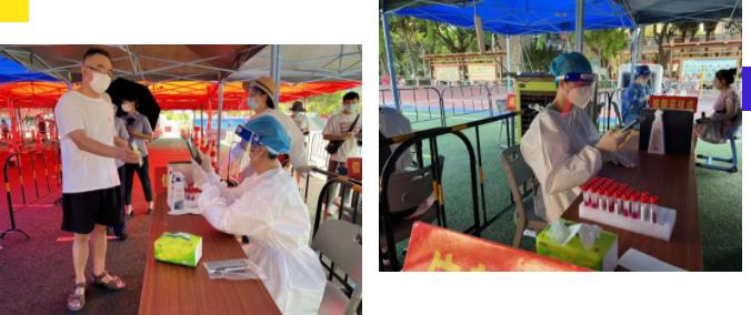 考虑到部分同事住在岛外,早上赶来担任志愿者交通不便,黄聪辉在排班时就主动要求排每天的第一班岗,他自己打趣道,“我黑我先上!”中午轮岗换班后,他回到休息室里第一件事就是帮其他志愿者们领好午饭,让大家能第一时间吃上热饭。午间的太阳更加毒辣,黄聪辉匆匆扒完午饭,就要求轮岗。 派驻第三纪检监察组工作人员黄聪辉:天气太热了,我早点上岗,其他志愿者就能早点吃饭休息下! 特写二 打造群众身边的“健康便利店” 杜军,是区委巡察办下沉到忠仑社区的志愿者,杜军在忠仑核酸检测点“既督又战”,负责协助指导检测点位的工作:“既要服务群众,也要协调推动解决困难,为基层减轻负担。” 忠仑社区核酸检测点不大 仅设置了两台检测台 主要承担周边安置房社区 1400多名居民的核酸检测任务 但近几日的检测量超出一倍多 达到3700人次左右 单台检测率全区领先。 工作量大,天气炎热,老人小孩居多 核酸点较小也不能专门设置绿色通道 考虑到这些情况,杜军在核酸点设置初期就“未雨绸缪”提出了改进措施,提前引导群众、优化采样流程、加快人员放行,让检测点位的“翻台率”高起来,也避免了长时间排队引发的人员聚集风险。 第一天开展核酸 杜军发现群众排队区域中午时段太阳直晒 温度过高,他立刻与街道、社区协商 紧急增加3台大电扇、4台降温机 加放冰块、扩装防晒网…… 各种降温“妙招” 为在场等候检测的居民群众送去凉意