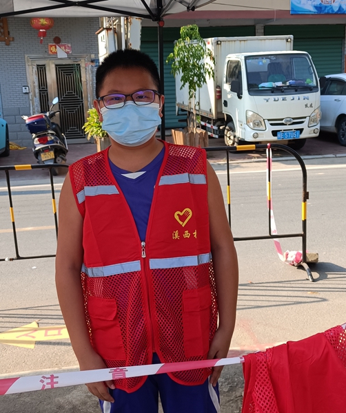 图二:小志愿者郑治。(后溪镇 供图) 小志愿者郑治 “我觉得,我可以帮上忙!” “我觉得,我可以帮上忙!”刚从新源小学毕业的郑治,是后溪镇溪西村下庄篮球场核酸采样点的小小志愿者。采样点进行布置时,郑治刚好在现场,看到围栏倒了,他上前帮忙扶起,工作人员热火朝天的状态感染了他。“我跟爸爸说,我要去做志愿者,出一份力。”郑治的爸爸表示支持孩子的想法,立马帮他报了名。几天下来,郑治从一开始腼腆不好意思,成长成采样现场广受好评的验码、引导小小志愿者。“能帮助到大家,很开心。”郑治觉得自己的这个暑假格外有意义。
