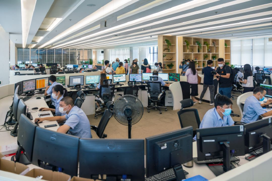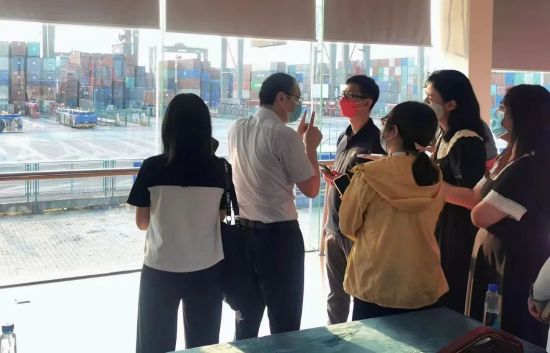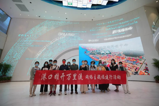 采访团在厦门国际航运科创中心一层展厅合影 采访团一行首先参观了厦门国际航运科创中心。展厅将码头智能控制按功能进行可视化展示,展现了近年来厦门港在智慧、绿色、信息港口建设方面取得的一系列成就。厦门集装箱码头集团相关负责人介绍,2020年初疫情发生后,在国际航运秩序受冲击、全球港口不畅的情况下,厦门港顶住压力、从容应对,未有一天停转,积极为合作方提供物流供应链一体化解决方案,创新实施“卸船直提”“出口直装”模式,有效解决交通物流难、供应链协同配套难等问题。