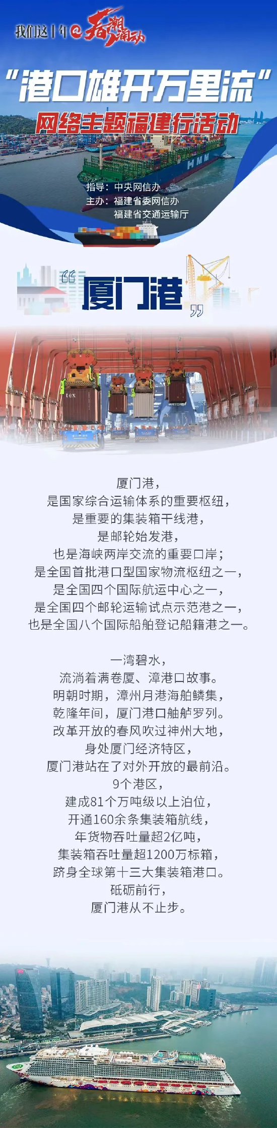 港口雄开万里流|第四站,厦门港:绿色智慧港口引领高质量发展 8月23日下午,由中央网信办传播局指导,省委网信办、省交通运输厅主办的“港口雄开万里流”网络主题福建行活动最后一站,来到全国综合运输体系的重要枢纽、海峡两岸交流的重要口岸——厦门港。
