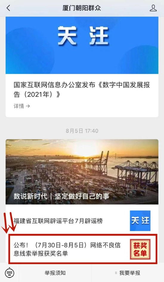 上哪看举报有没有获奖呢? 获奖名单在“厦门朝阳群众”微信公众号 每周五的推送中公布!