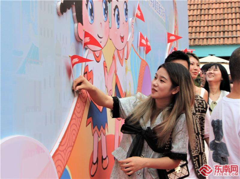 文明达人代表在展板上插上“文明旗帜。东南网记者 李霖 摄