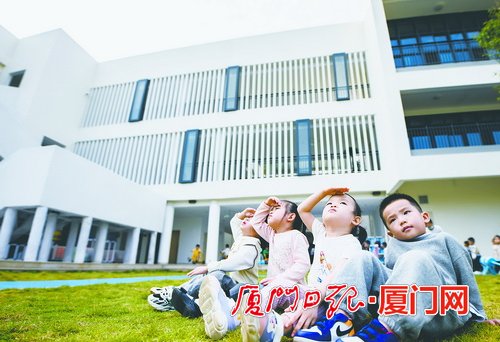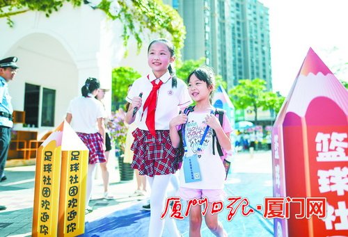禾穆幼儿园的小朋友们在户外活动。 (厦门日报记者 林铭鸿 摄) 湖里实小迎新志愿者引导新生开学。(厦门日报记者 林铭鸿 摄)