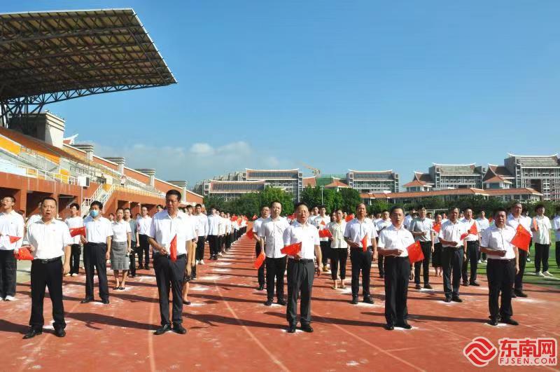 师生挥舞着红旗,同唱歌曲《我和我的祖国》(厦门医学院供图)