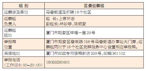 五届翔安区委第二轮第一批巡察展开 厦门日报讯 (记者 邵凌丰 通讯员 林菲菲)根据《中国共产党巡视工作条例》《关于市县党委建立巡察制度的意见》《中共翔安区委巡察工作实施办法》以及省、市、区委相关规定和部署要求,经翔安区委巡察工作领导小组研究决定,自2022年10月9日起启动五届翔安区委第二轮第一批巡察工作,对马巷街道及所辖18个社区开展常规巡察,为期30个工作日左右。 信访受理范围:根据区委巡察工作要求和巡察工作职责,区委巡察组主要受理反映被巡察单位领导班子及其成员和下一级领导班子主要负责人及重要岗位领导干部问题的来信、来电、来访,重点是关于违反政治纪律、组织纪律、廉洁纪律、群众纪律、工作纪律、生活纪律等方面的举报和反映。其他不属于巡察受理范围的信访问题,将按规定由被巡察单位和有关部门处理。