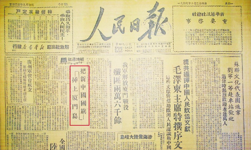 ▲1949年10月24日,《人民日报》头版以《把新中国国旗插上厦门岛》为题详细报道了神山战斗。(资料图)