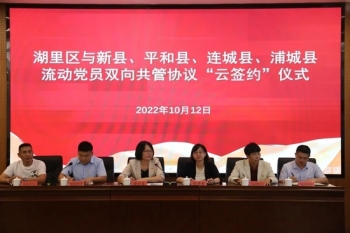为加强流动党员教育管理,湖里区与河南新县、福建平和、连城、浦城等四县签订流动党员双向共管协议,建立流动党员共建共管机制,搭建党建工作山海协作平台。 10月12日下午 流动党员双向共管协议 “云签约”仪式 在湖里区委党校顺利举行