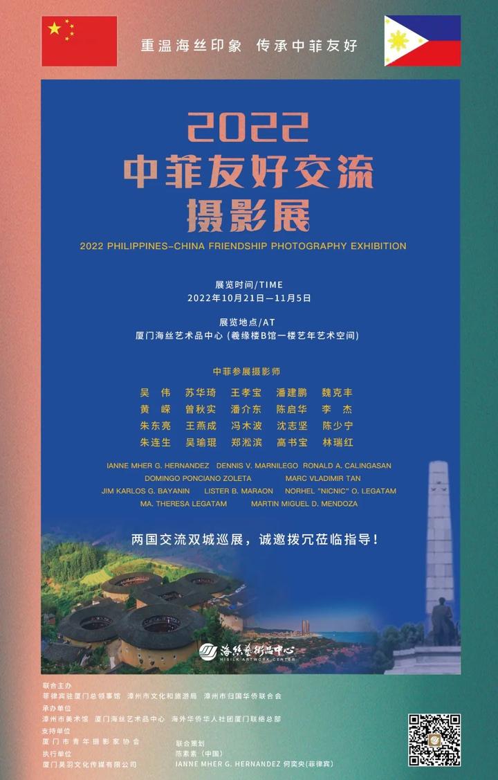 10月21日,由菲律宾驻厦门总领事馆、漳州市文化和旅游局和漳州市归国华侨联合会联合主办,厦门海丝艺术品中心、漳州市美术馆、海外华侨华人社团厦门联络总部共同承办,厦门市青年摄影家协会协办的2022中菲友好交流摄影展厦门专场在海丝艺术品中心羲缘楼B馆艺年·艺术空间开幕。