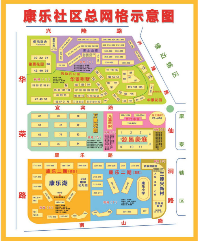 康乐社区总网格示意图 三是突出数据排查。建立了社区网格化、信息化的综合管理服务平台,组织发动网格员对辖内房屋、单位、机构、人员进行全覆盖排查摸底,先后核实房屋6012处,居民群众9241人,单位350家,达到了全员、全面、全域的目标。把所有的数据录入到社区网格化、信息化的综合管理服务平台,打通了网格服务和管理“双通道”,使原来分散的管理格局变得更加系统有序,确保事件任务横向协调处置,纵向互联互通,有效提高管理效率,提升服务质量,实现“管理网格化、平台生活化、治理多元化、服务专业化”,推进社区工作又好又快发展。