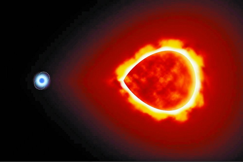 它 中子星“隐士” 大质量恒星 生命周期结束后 核心留下的 致密天体 在浩瀚的宇宙中,有一种一直被忽视的神秘天体——中子星。从学名上说,中子星是质量为8至25倍太阳质量的恒星结束其生命周期后核心留下的致密天体,中子星星族记录了大质量恒星的质量分布、演化历史、银河系金属增丰等关键信息,例如,有人认为,地球上的黄金有可能由中子星的碰撞产生。依据恒星演化理论,银河系中存在数十亿颗中子星。 在天体中,中子星是个小不点,它的直径一般只有二十公里左右,但它却拥有 “恐怖的密度”——一立方厘米的中子星就能达到上亿吨,等价于整个喜马拉雅山的质量。 随着科学技术的发展,天文学家们对于中子星的探究也如火如荼地开展着,他们希望通过中子星的演化来探究宇宙当中更深层次的问题——黑洞的来源,以及物质的极限压缩状态…… 宁静态中子星 隐身宇宙 难以被探测 天文学家利用各种不同的方法来搜寻发现中子星。其中包括:高速旋转的中子星产生脉冲信号,被天文学家通过射电望远镜观测到(射电脉冲星);双星系统中致密天体吸积伴星的气体物质形成吸积盘,发出明亮的X射线,天文学家靠“看”来找到中子星;双中子星或黑洞中子星双星并合会发出引力波,天文学家靠“听”来找到它们。 但是,还有一些中子星是处于宁静态,既探测不到脉冲信号又没有发出X射线。这些宇宙中难以发现的、深藏不露的神秘天体,一直以来都是天文学家研究的热点和难点。 它 红矮星“伴舞” 红矮星被中子星强大的潮汐力拉扯成了水滴形状,围绕中子星公转,而随着这一公转过程,其在观测者视线方向的投影面积也会发生周期性变化,导致了亮度也发生周期性变化,形成了独特的椭圆调制现象。