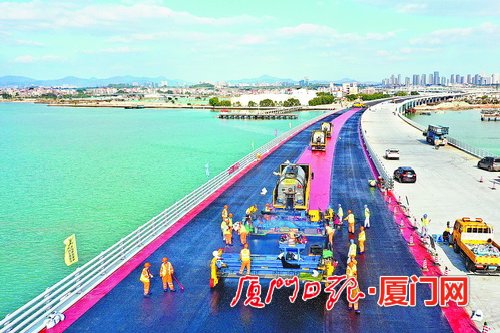翔安大桥跨海段开始铺沥青 预计12月底完成,届时大桥主线将初步具备行车条件