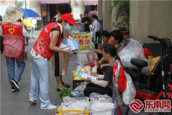 集美区疾病预防控制中心党员志愿者沿街分发防疫宣传单。(集美区卫健局供图)