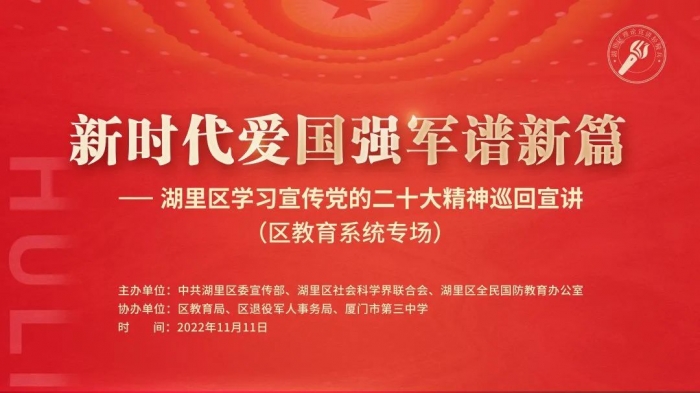 为深入学习习近平强军思想,学习宣传贯彻党的二十大精神,11月11日,由中共湖里区委宣传部、湖里区社会科学界联合会、湖里区全民国防教育办公室、湖里区教育局以及湖里区退役军人事务局共同组织的“新时代爱国强军谱新篇“”——湖里区学习宣传党的二十大精神巡回宣讲走进厦门市第三中学。