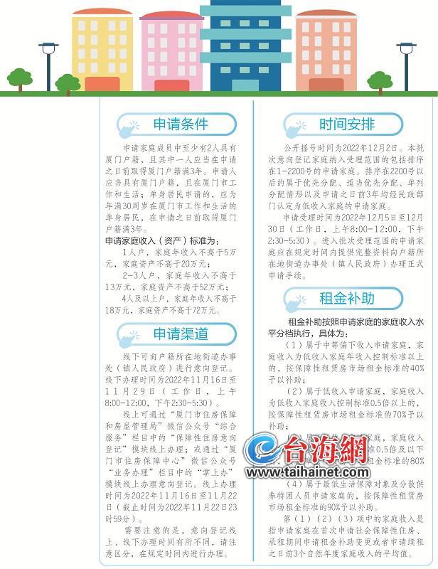 东南网11月16日讯(海峡导报记者 陈颖娴)好消息!厦门市今年第四批保障性租赁房今日启动意向登记。本批次面向厦门市住房困难的低收入、中等偏下收入的申请家庭配租。日前,厦门市住房局已发布方案通知。 根据方案,本批次均为厦门岛外房源,共约2200套,主要集中安排在海沧区的新阳居住区(一房型、二房型、三房型)、翔安区的黎安居住区(一房型、二房型、三房型)、同安区的祥平地铁社区(二房型、三房型),另有岛外其他保障性住房项目的零星房源。 需要注意的是,每种房型的数量和地点,将根据取得本批次保障性租赁房轮候资格的各房型申请家庭数量及届时的实际房源数量调整后确定,以《选房手册》为准。 其中,各房型面积标准为:一房型建筑面积约45平方米,二房型建筑面积约60平方米,三房型建筑面积约70平方米。 1人户可以配租一房型;2人户及夫妻带一个无民事行为能力或者限制民事行为能力子女的家庭,可以配租二房型;3人及以上户(不含夫妻带一个无民事行为能力或者限制民事行为能力子女的家庭),可以配租三房型。 |