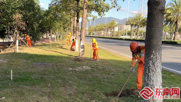 挖坑施肥好过冬 厦门公路部门加强管养绿地养护