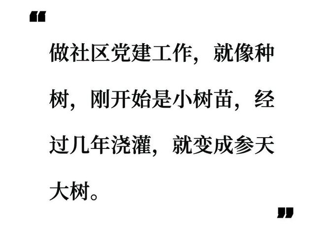 她说,做社区党建工作,就像种树,刚开始是小树苗,经过几年浇灌,就变成参天大树,而我们每个人也会像树一样,成长并成熟。